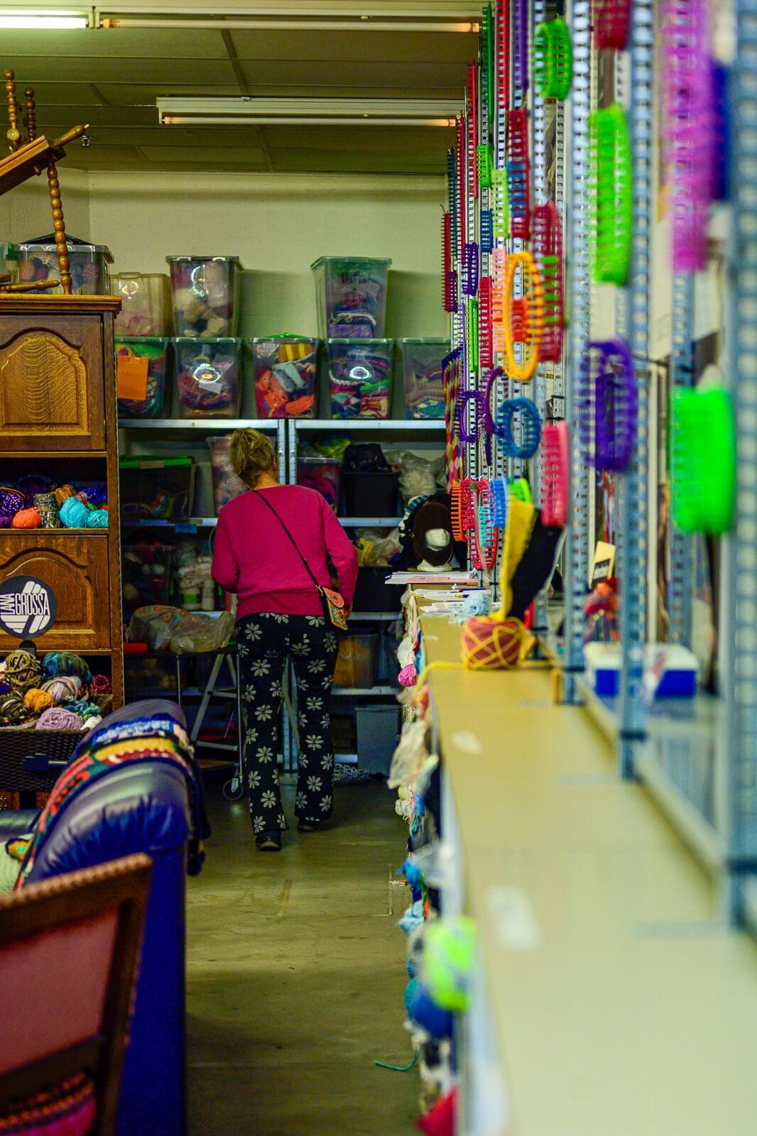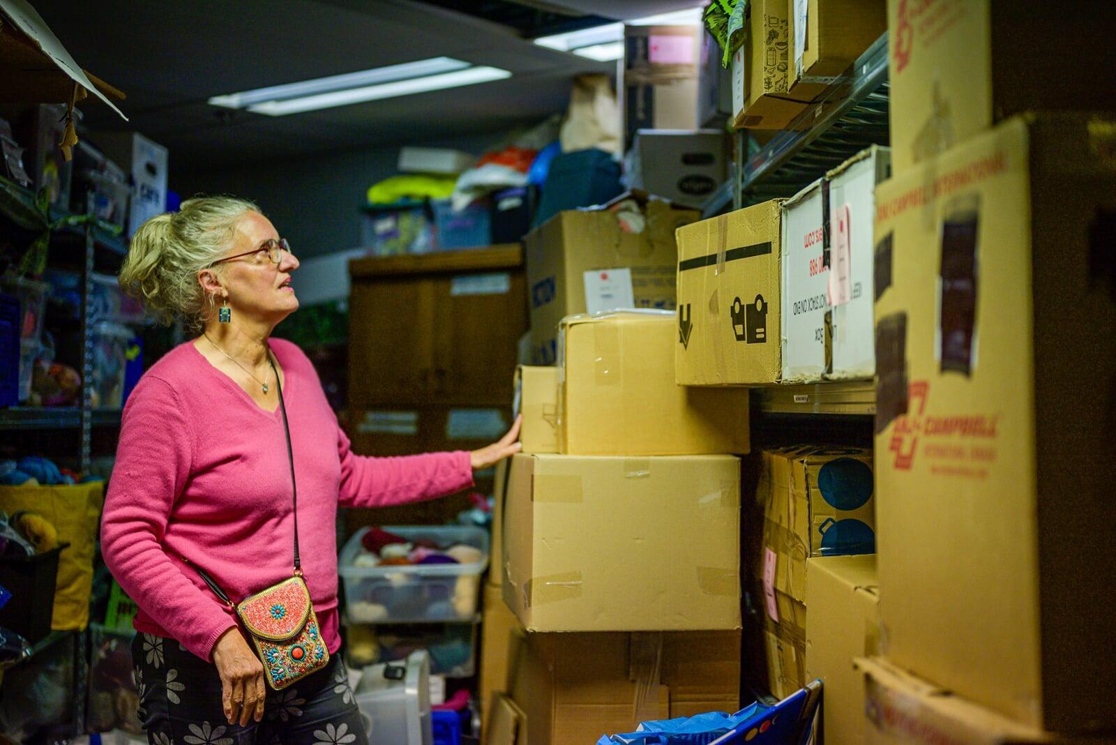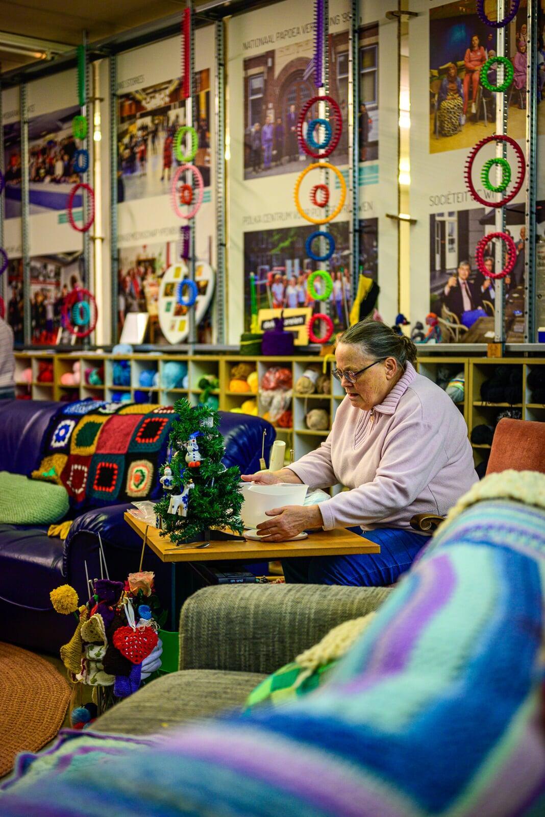 De wol waarmee de dames werken is gedoneerd, meestal omdat het ergens nog in een kast of op zolder lag. Op het hoofdkwartier wordt ook gebreid, maar doen ze meer. “We verzamelen de woldonaties en gebreide items in, sorteren en verspreiden dat weer. De gebreide items gaan naar organisaties als Leger des Heils, Straat Pastoraat en crisisopvang. Breiclubs krijgen wol om mee te werken. Ook verdelen we donaties zoals kleding voor daklozen. Tweedehands spullen verkopen we om ons werk te financieren. Er is altijd reuring en werk te doen. De huiskamer is echt een ontmoetingsplaats en ook een veilige haven met wel mensen van 100 nationaliteiten bij onze breiborrels. Er wordt gewerkt en geleefd, het is er gezellig en levendig.”