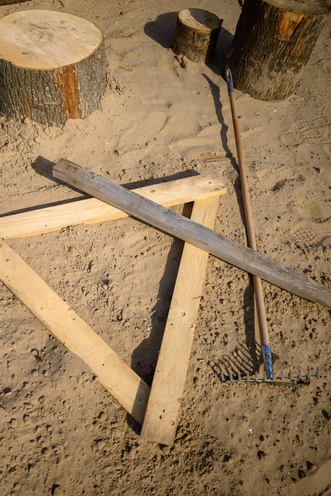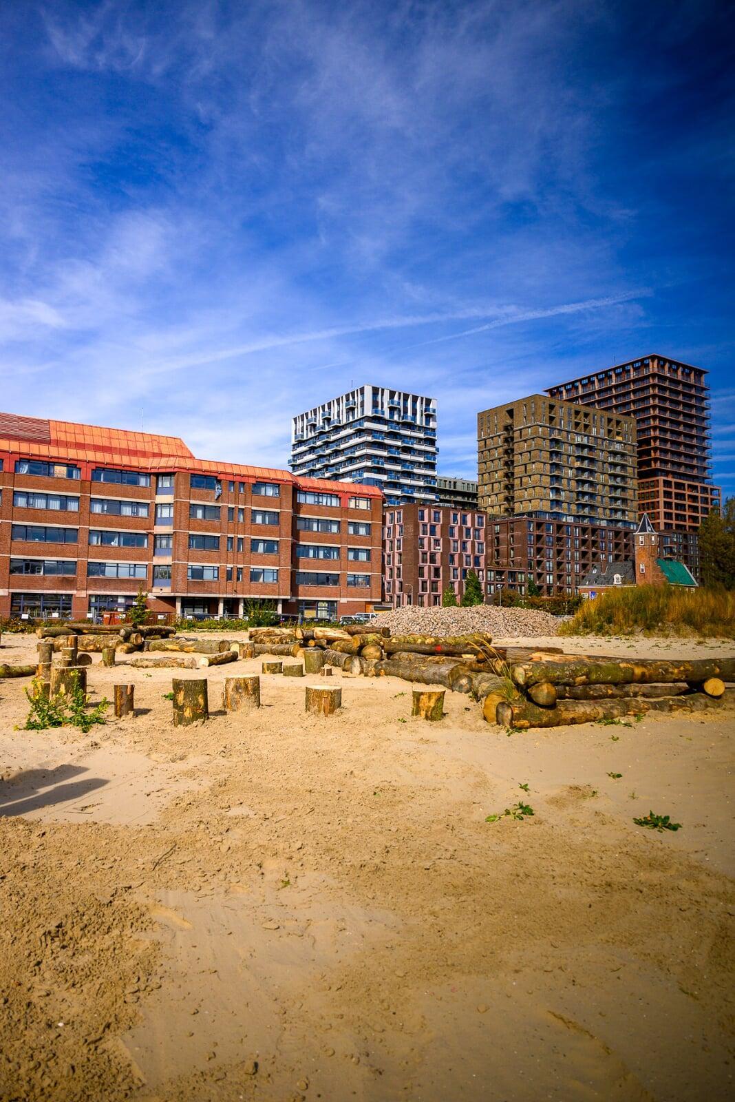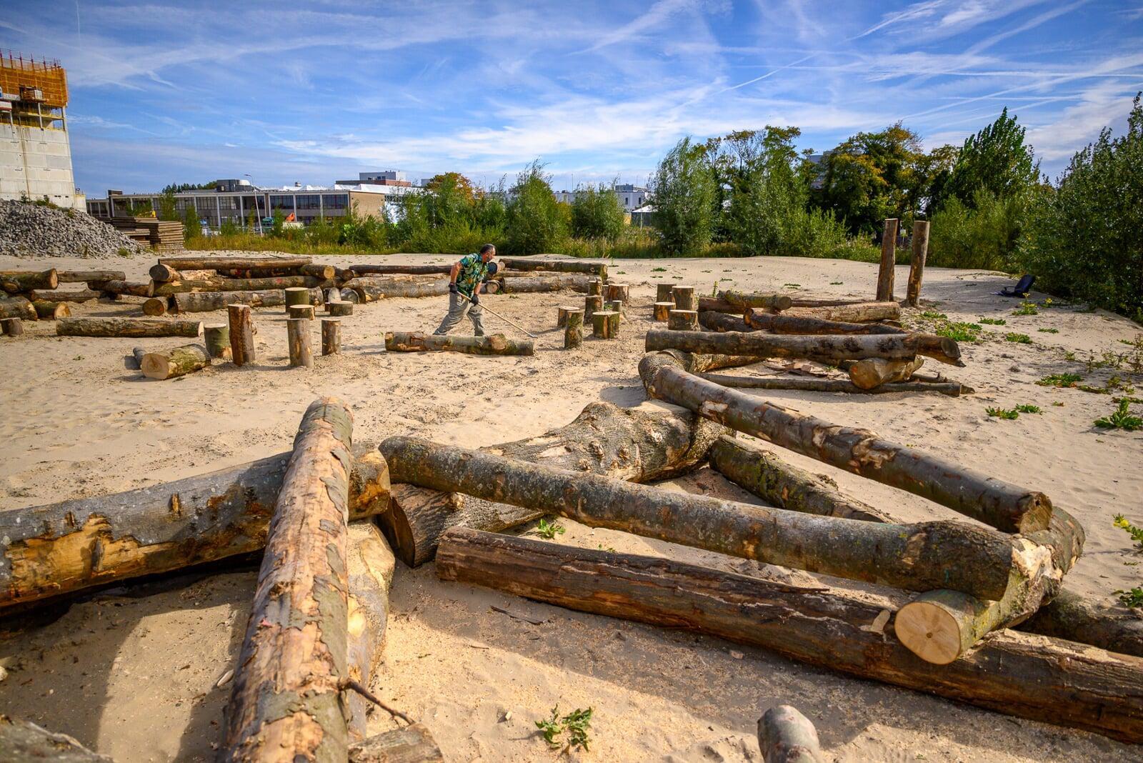 Voor Zandhaven zijn 120 boomstammen hergebruikt. “Afkomstig uit Utrecht en Wassenaar. Alle stammen zijn met houten pinnen bevestigd of vallen op elkaar in gleuven. Echt superstevig! Oude koffiezakken vormen het worteldoek van de driehoeken. En, mocht de constructie dus toch moeten verhuizen, is dat geen probleem en is alles her te gebruiken,’’ aldus Nanko.